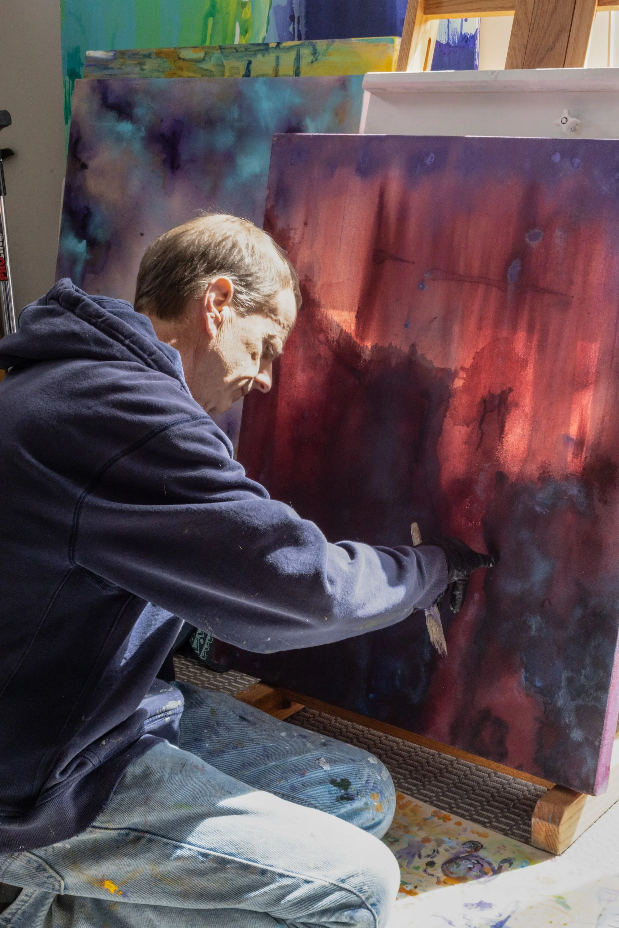 I paint with acrylic, casein, oil and spray paint on hand stretched canvas and found panel.
